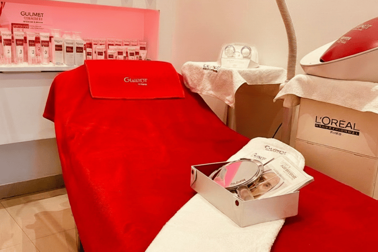 Nos cabines d'esthétiques raffinées aux couleurs de Guinot Paris sont conçues pour des soins du visage d'excellence, des épilations minutieuses ainsi que pour nos services de massages.